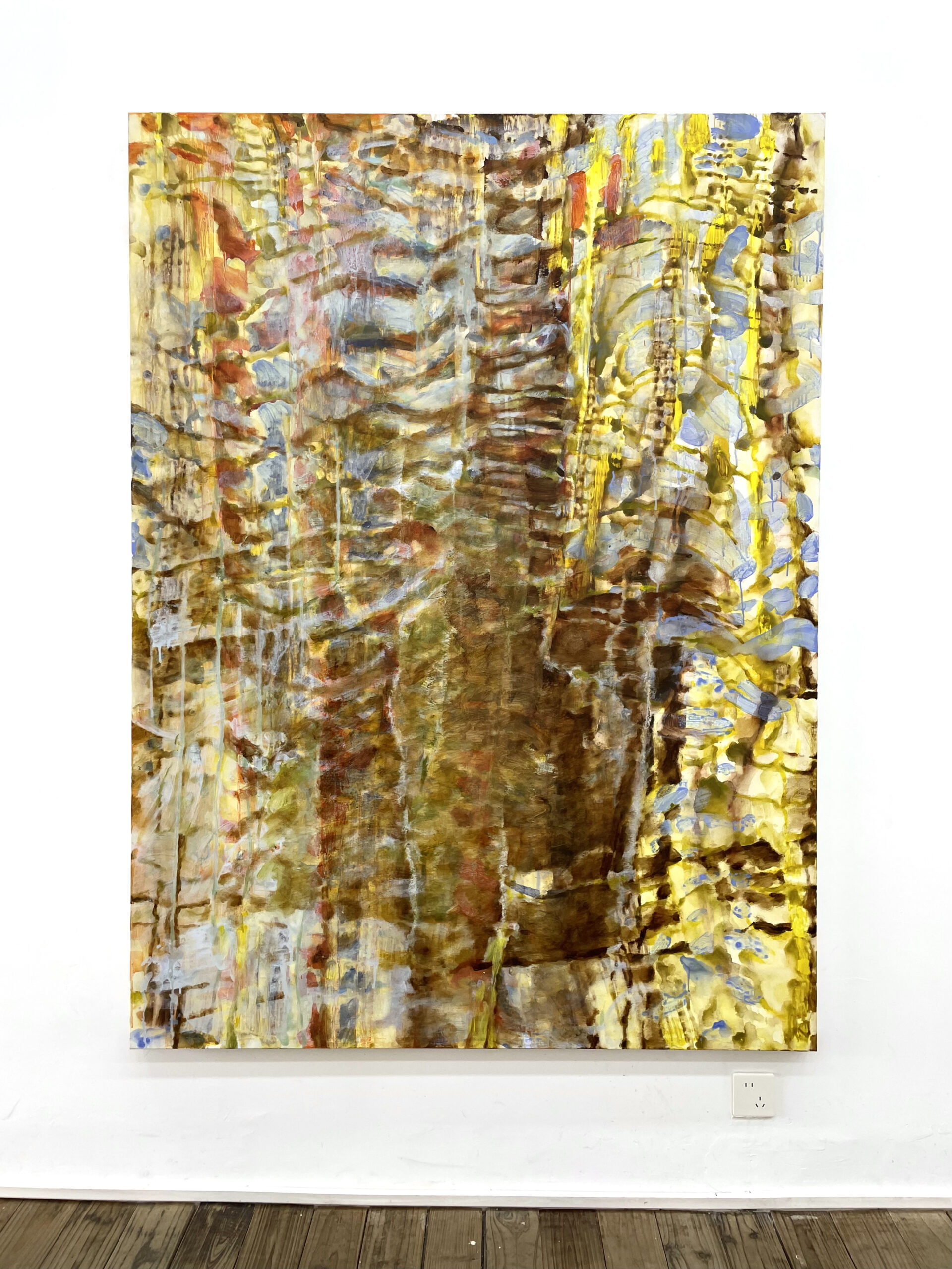 Nicole Di is a British Chinese artist based in London, she graduated from Goldsmiths in 2025 where she was awarded the Cass Art Materials award. For Nicole, making is an embodied and physical way of attuning her sensitivity. Her work considers nature's behaviour rather than its appearance. The Daoist notion of Change, turbulence, and the infinite, drives her interest in the points where nature's systems and rules begin to break down and become speculative. The eye is weaved through these polyphonic spaces, which she thinks of as journeys. Patterns of unintentional coordination calibrate and recalibrate- spiralling in a constant becoming and never arriving. Processes of erasure, folding, pouring, peeling and working on both sides of the surface, are used to open up the work to contingency, which for Nicole, is a tool for a different kind of noticing.